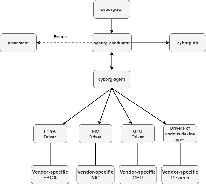 Vendor drivers - Cyborg can be integrated with drivers for various accelerator device types, such as FPGA, GPU, NIC, and so forth. You are welcome to extend your own driver for a new type of accelerator device.