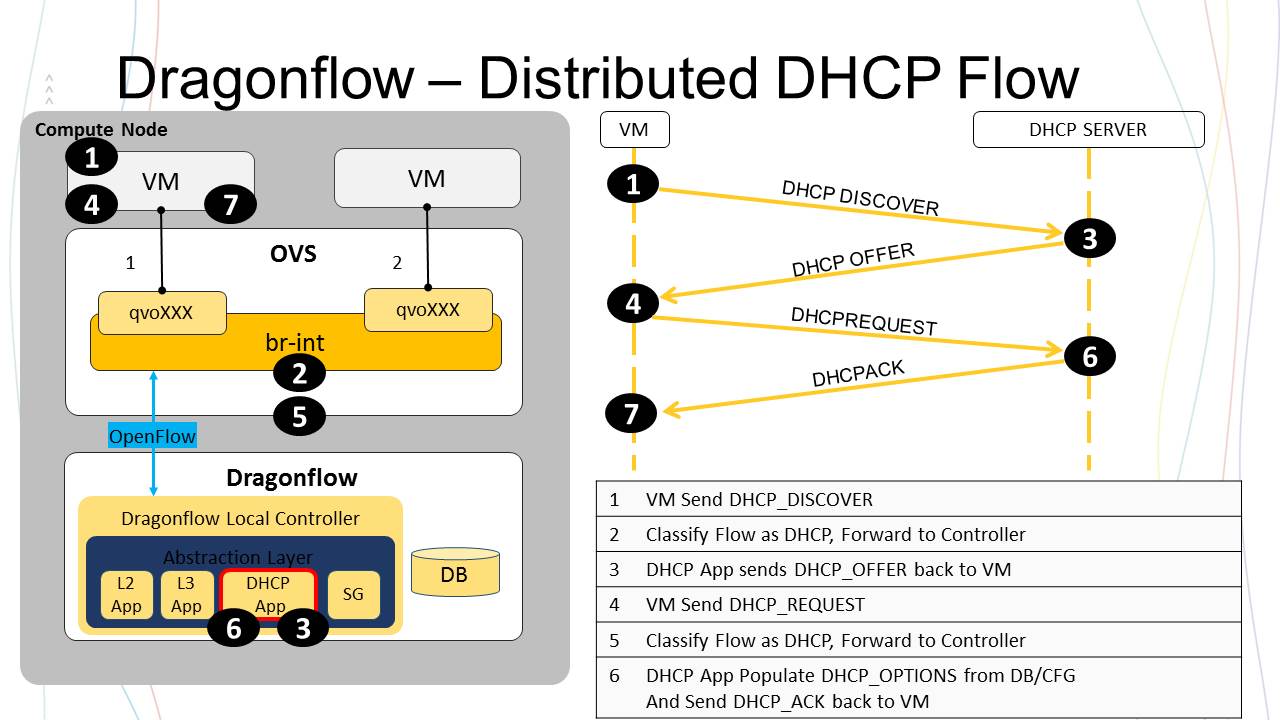 The local DHCP application handle the redirected DHCP packets and answer as a DHCP server. DHCP traffic is handled directly at the compute node and never goes on the network.