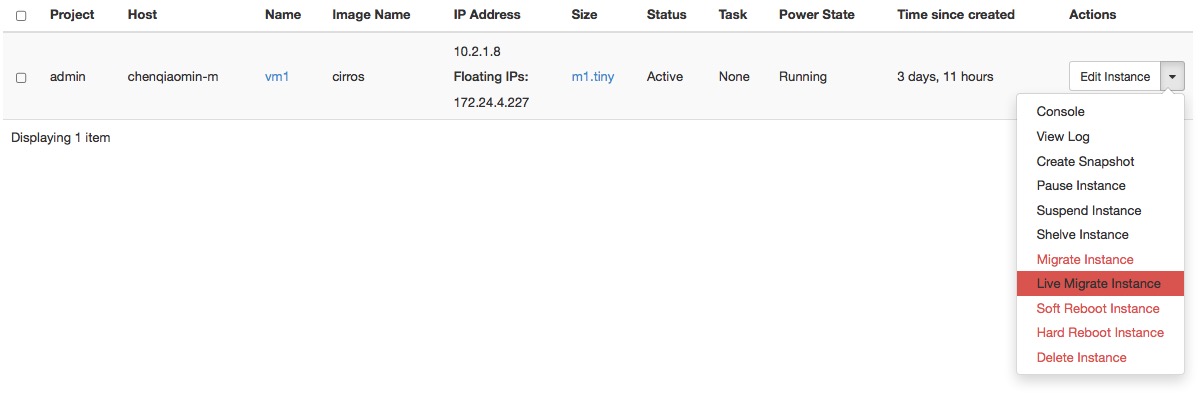 As an administrative user, you can manage instances for users in various projects. You can view, terminate, edit, perform a soft or hard reboot, create a snapshot from, and migrate instances. You can also view the logs for instances or launch a VNC console for an instance.