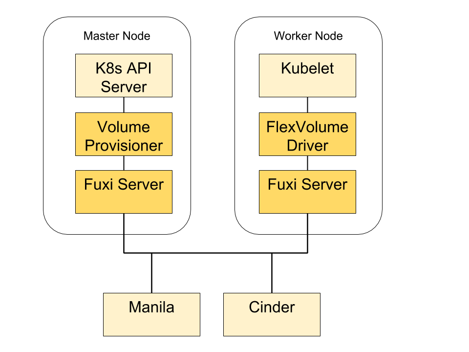 In order to integrate Kubernetes with OpenStack and satisfy the requirements above, this spec proposes to develop two components: A volume provisioner and a FlexVolume driver. The volume provisioner runs on the Kubernetes control plane and is responsible to watch for Kubernetes API for changes of PVCs and provision PVs for PVCs. The FlexVolume driver will reside on each host that runs Kubelet and it will be called out by Kubelet to perform local operations, such as attach volumes to hosts, etc.. Both volume provisioner and FlexVolume driver will consume OpenStack storage services via Fuxi server.