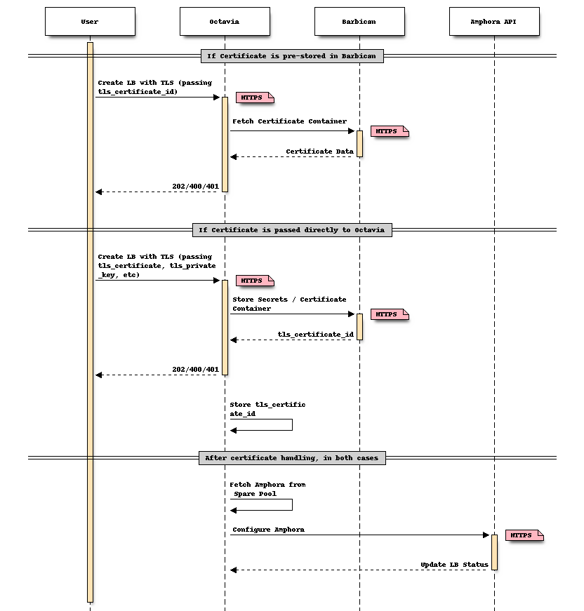 1. Create a CertificateManager interface for storing and retrieving certificate and private key pairs (and intermediate certs / private key passphrase). Users will pass their TLS data to Octavia in the form of a certificate_id, which is a reference to their data in some secure service. Octavia will store that certificate_id for each Listener/SNI and will retrieve the data when necessary. (Barbican specific: users will need to add Octavia’s user account as an authorized user on the Container and all Secrets [1] so we catch fetch the data on their behalf.)