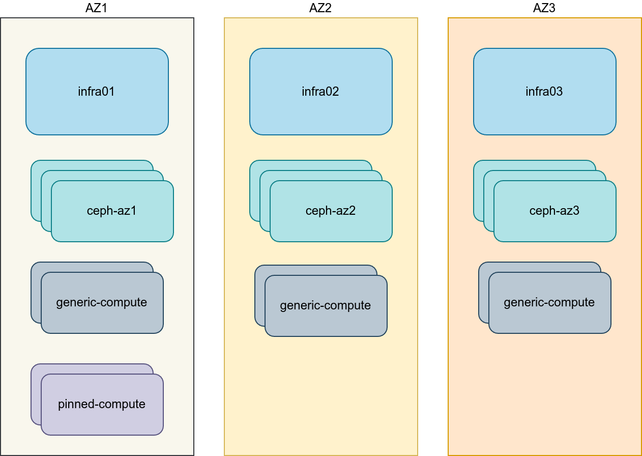 Во-первых, в любой зоне доступности есть только один контроллер, в то время как для высокой доступности необходимо запустить несколько копий cinder_volume для каждого провайдера хранилища. Поскольку cinder_volume нужен доступ к сети хранения, одним из лучших мест для него являются хосты ceph-mon.