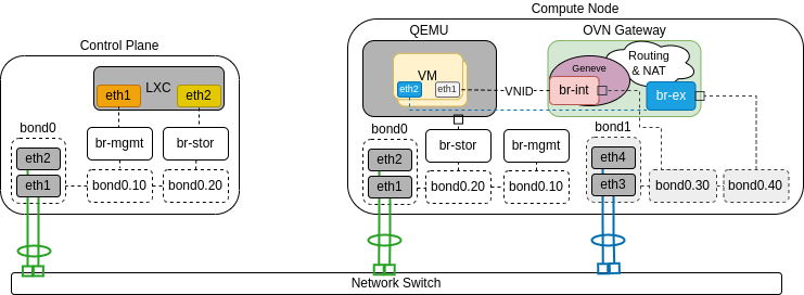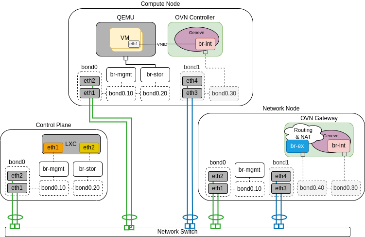 OpenStack-Ansible supports the use of a single interface or set of bonded interfaces that carry traffic for OpenStack services as well as instances.