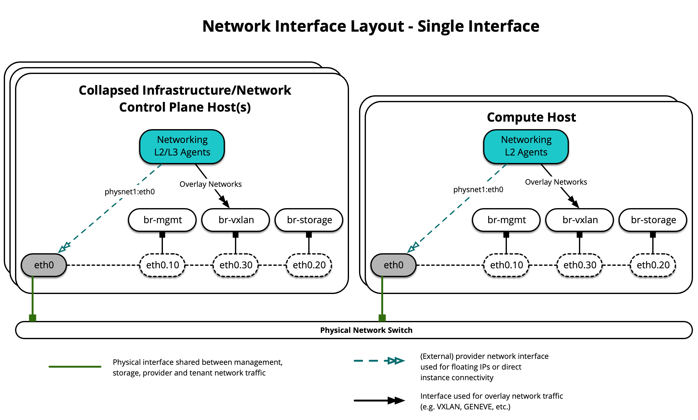 The following diagram demonstrates hosts using a single interface for OVS and LinuxBridge Scenario: