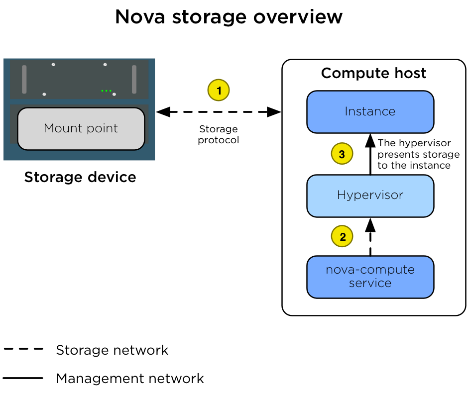 In many environments, the ephemeral disks are stored on the Compute host’s local disks, but for production environments we recommend that the Compute hosts be configured to use a shared storage subsystem instead. A shared storage subsystem allows quick, live instance migration between Compute hosts, which is useful when the administrator needs to perform maintenance on the Compute host and wants to evacuate it. Using a shared storage subsystem also allows the recovery of instances when a Compute host goes offline. The administrator is able to evacuate the instance to another Compute host and boot it up again. The following diagram illustrates the interactions between the storage device, the Compute host, the hypervisor, and the instance.