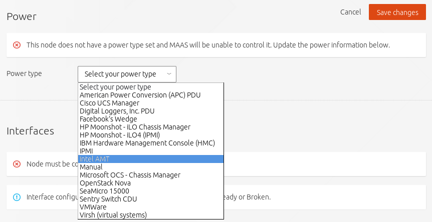 In order to fully manage a deployment, MAAS needs to be able power cycle each node. This is why MAAS will attempt to power each node off during the discovery phase. If your hardware does not power off, it’s likely that it’s not using an IPMI based BMC and you will need to edit a node’s power configuration to enable MAAS to control its power. See the MAAS documentation for more information on power types, including a table showing a feature comparison for the supported BMC drivers.