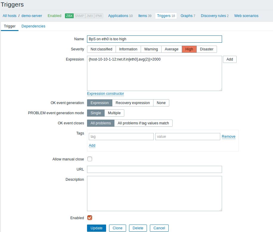 Create a trigger with a name which contains the keyword BpS (e.g. BpS in the eth0 is too high) and add to that trigger an expression-condition which will generate an event if the traffic will set this expression-condition to True. The expression-condition is: