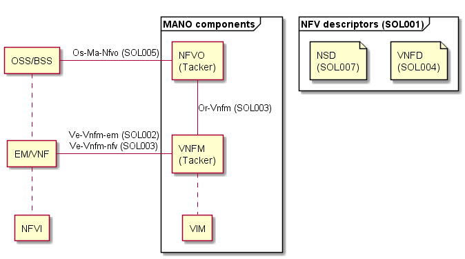 Tacker provides a functional block of NFVO and VNFM. VIM can be an OpenStack or Kubernetes cluster. In a particular use case to deploy a VNF instance, you need to prepare a VNF Package. A VNF Package includes VNFD, software images for Virtual Machine (VM), and other artifact resources such as scripts and config files. NFVO is called to deploy a VNF instance with a VNF Package, then NFVO asks VNFM to deploy actual VNF on a NFV infrastructure. All the interfaces involved in this process is defined in ETSI NFV specifications.