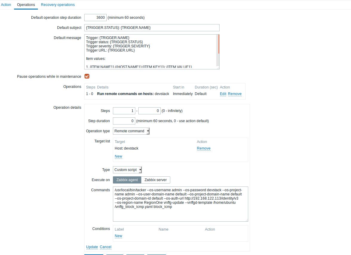 Create an action which will update the classifier if a trigger with the BpS name will generated by the Zabbix server. To do this you need to create an action , set the keyword of the Trigger which will make this action to actually come to play and also you need to create an operation inside that action where you will write the update-vnffg command which you will execute to update the current classifier.