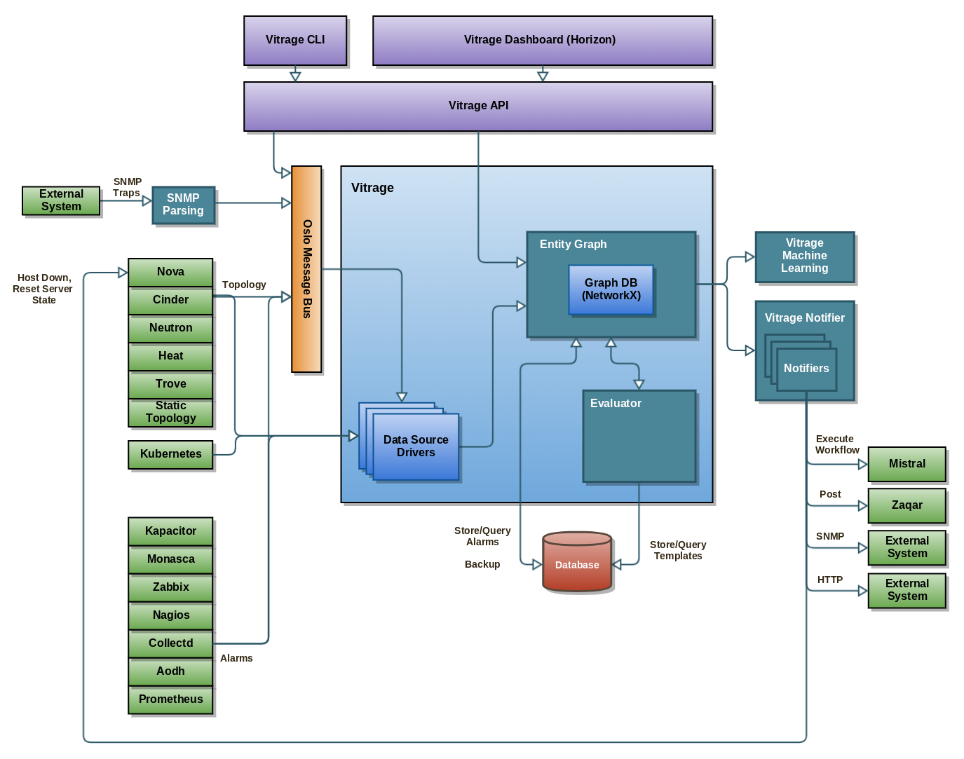 Vitrage Data Sources are responsible for importing information from different sources, regarding the state of the system. This includes information regarding resources (physical, virtual, and applications) and alarms. The information is then processed into the Vitrage Graph. Currently Vitrage supports OpenStack datasources like Nova, Cinder, Neutron, Heat and Aodh, as well as external monitors like Nagios, Zabbix and collectd.