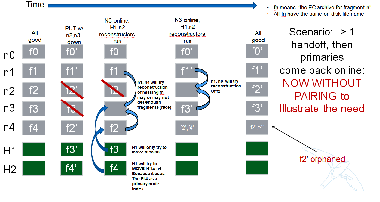 In doing this, we minimize the reconstruction races but still enable all 6 nodes to be working on reconstruction for a failed HDD as the partitions will be distributed amongst all of the nodes therefore the node with the dead HDD will potentially have all other nodes pushing reconstructed EC archives to the handoff node in parallel on different partitions with every partition having at most 2 nodes racing to reconstruct its archives.