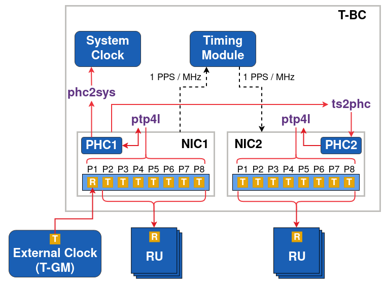 This scenario presents an example of T-GM setup where the two NICs use GNSS as the precise time source. This configuration can be extended to include additional NICs.