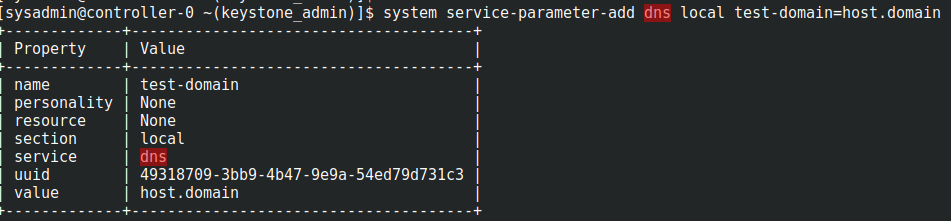 ~(keystone_admin)]$ system service-parameter-add dns local test-domain=host.domain