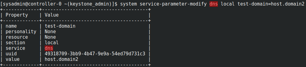 ~(keystone_admin)]$ system service-parameter-modify dns local test-domain=host.domain2